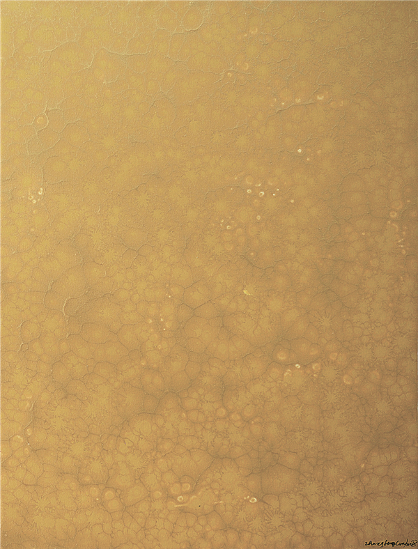 Red, yellow, and blue are the three prime colors in the universe and more than 20 million kinds of colors which can be recognized by eyes consists of three prime colors. Zhang Fangcun dilutes the three prime colors to a proper degree (degree for reaction). The colors in the blank canvas present to be various and wonderful, the composition forms present to be chaotic and natural, and the natural textures present to be spiral and waving ripples.